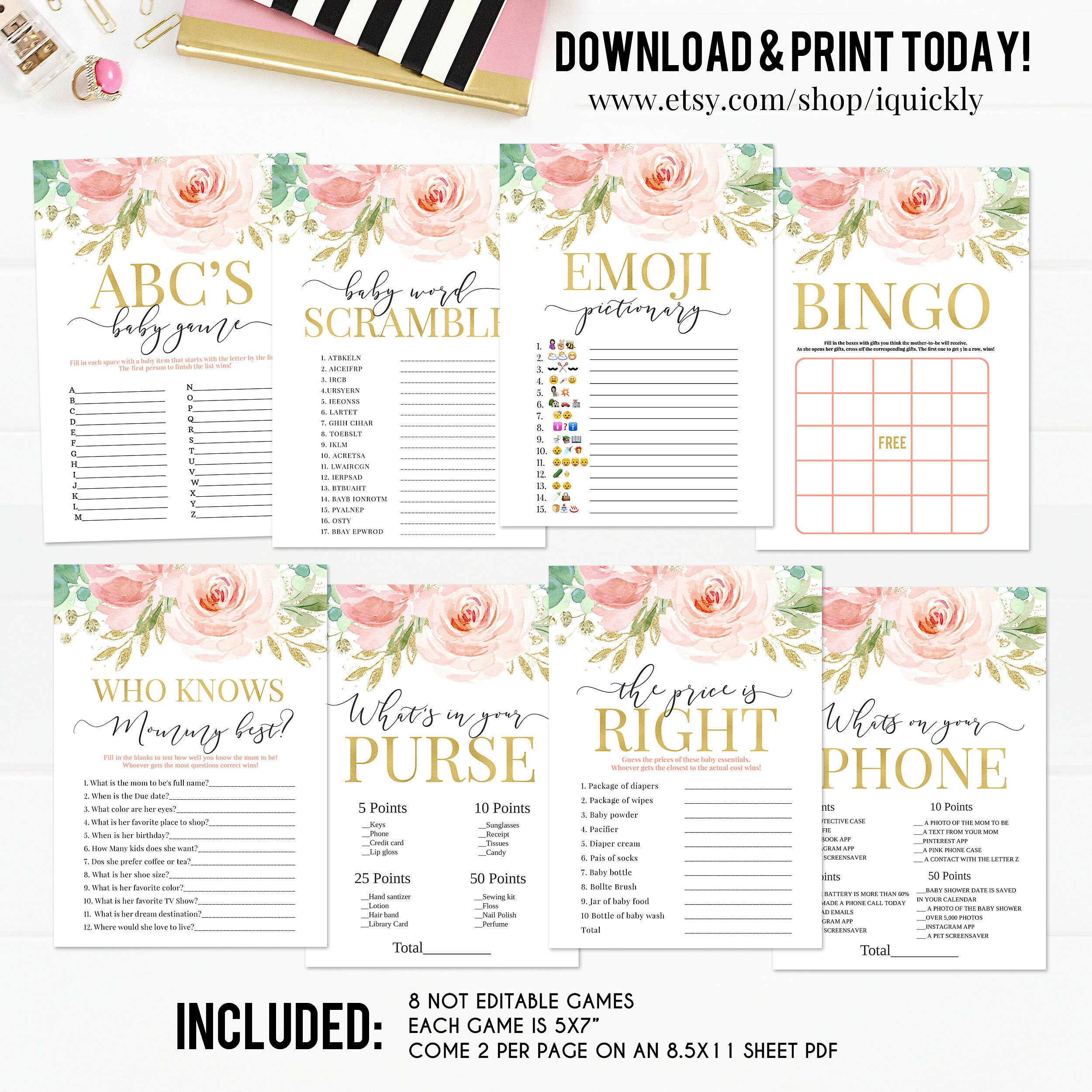 Blush Pink Floral Baby Shower Games Pink And Gold Baby Shower Etsy
